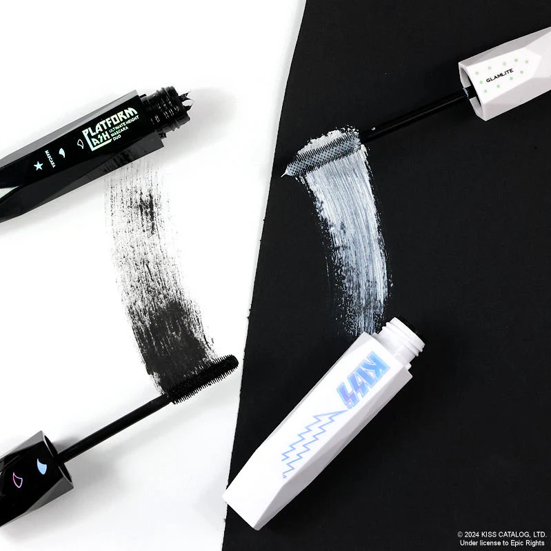Rock your look with the "Platform Lash" duo, inspired by the legendary platforms of KISS! Prep with the gleaming white primer, then layer on the bold black mascara for stage high volume and drama. Package based on inspiration from KISS's iconic shoes. This duo lets your lashes strut with the audacity of a rockstar.
